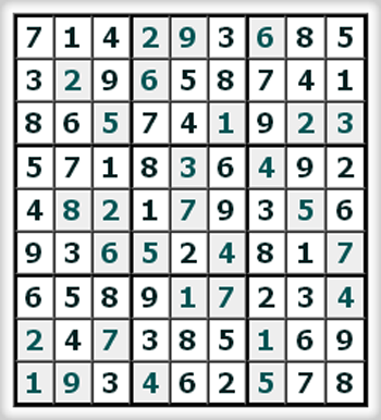 Материалы данного сайта являются объектом авторского права. Сгенерированные на сайте Судоку можно использовать только непосредственно для их личного разгадывания. Перепечатка, копирование и публикация Судоку - не допускается!